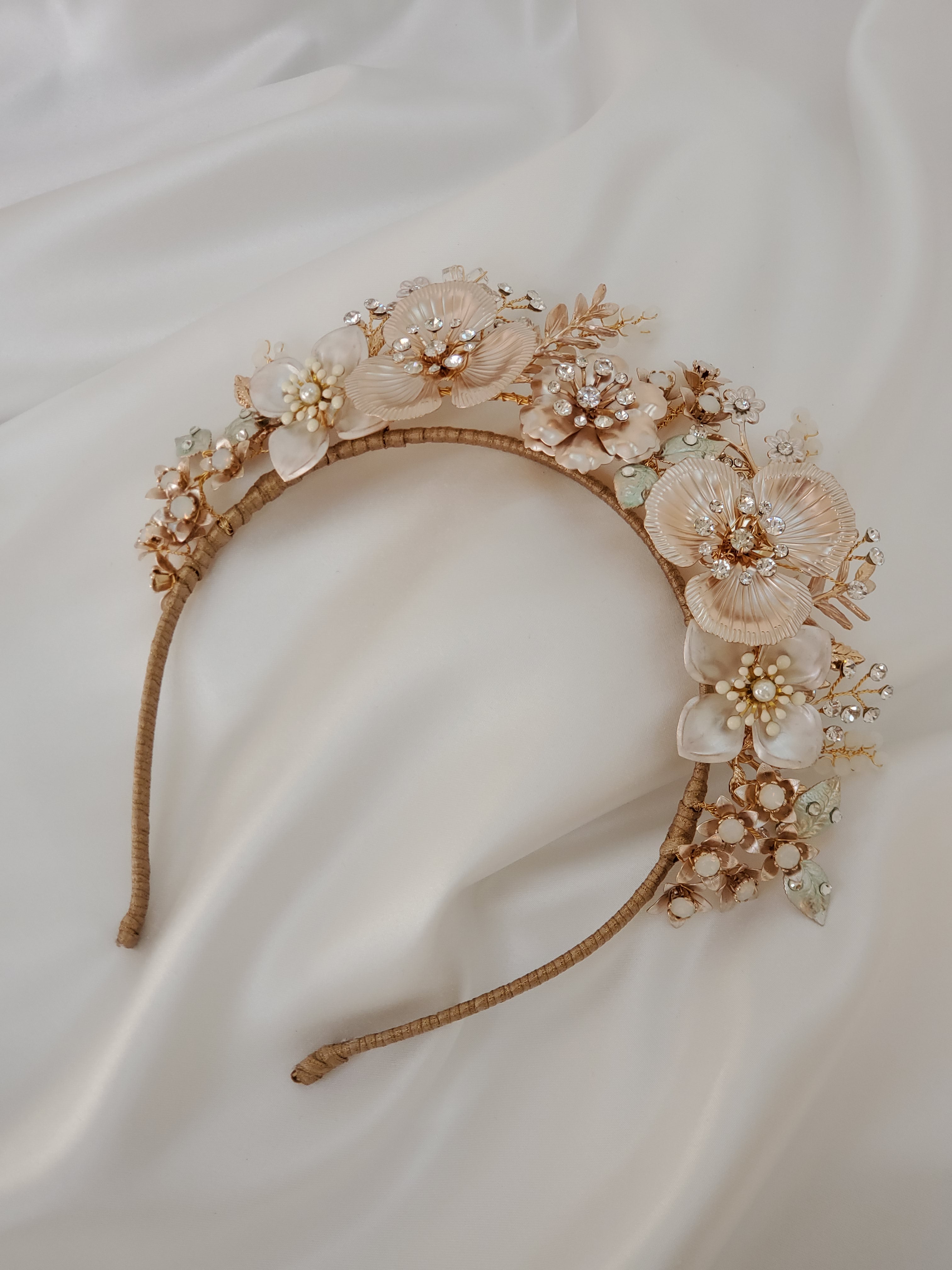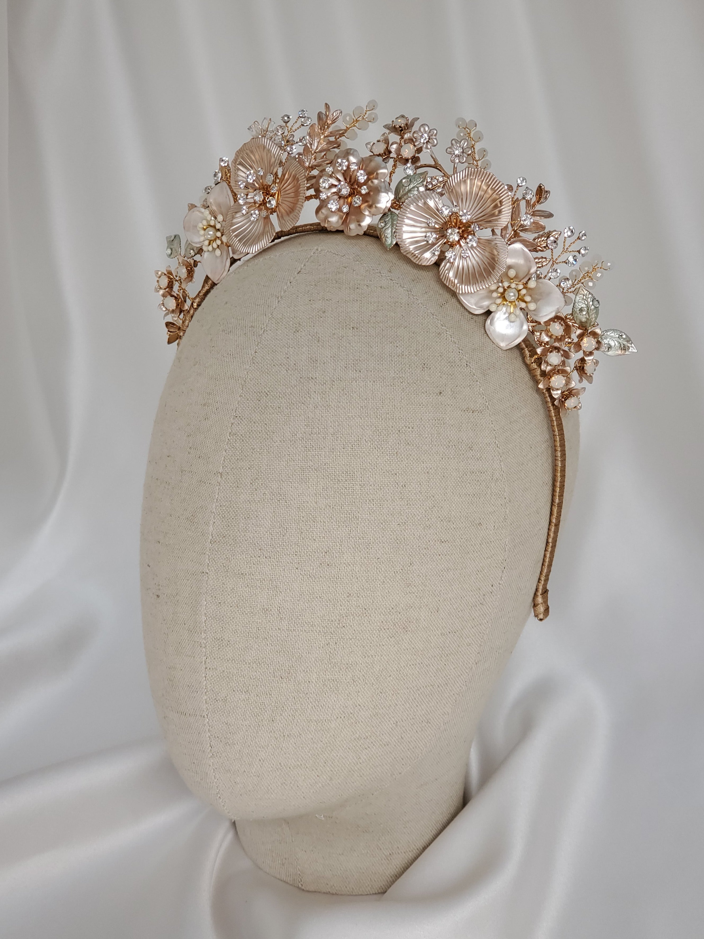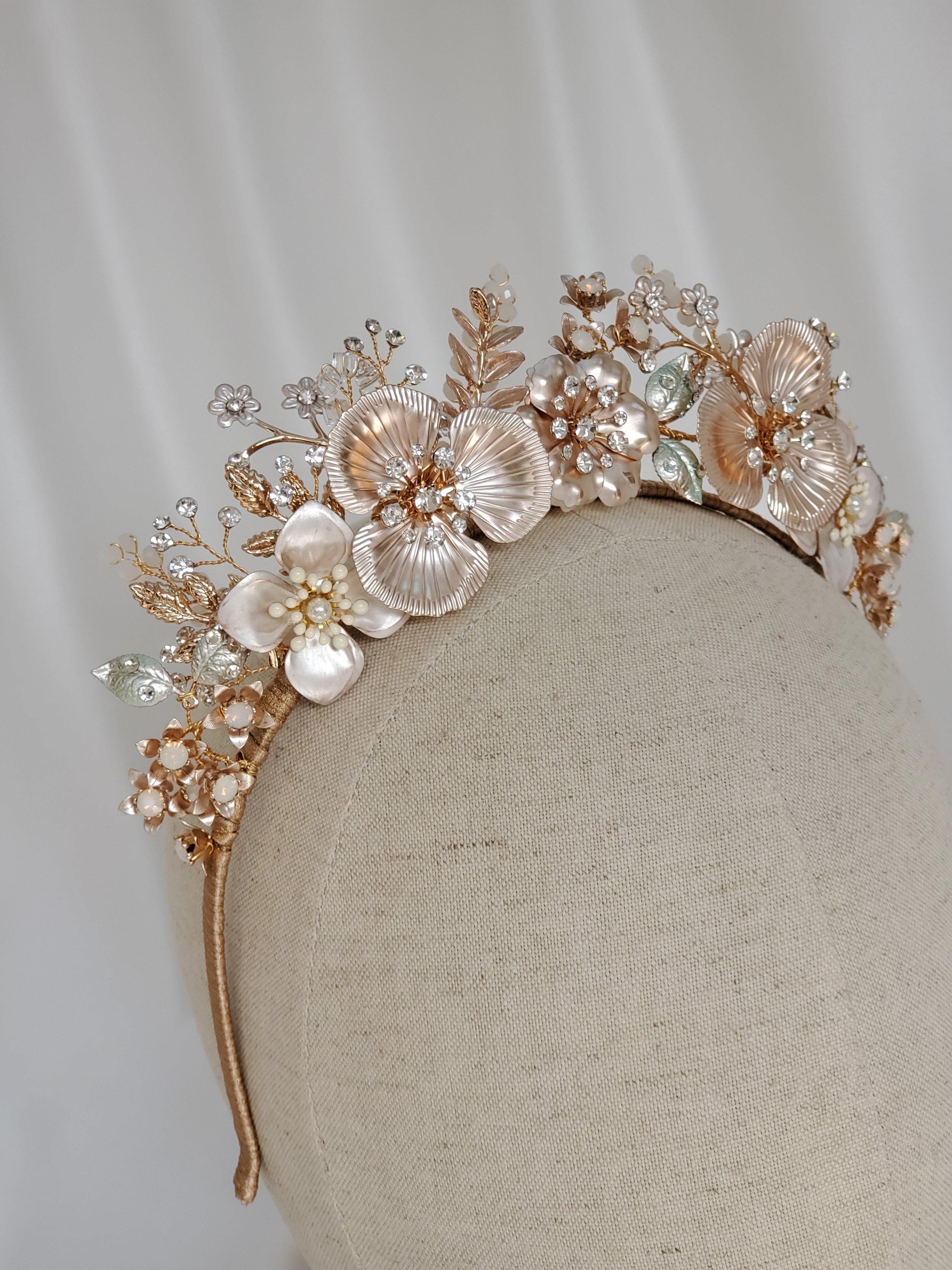 Embrace your inner deity with the Antonella Crown, a breathtaking headpiece that blends ethereal beauty with regal opulence. Delicately handcrafted light champagne gold florals bloom alongside whisper-soft pastel mint leaves, creating a uniquely captivating color palette that is both fresh and timeless. Each petal and leaf is meticulously adorned with luxurious, light-catching rhinestones, casting a brilliant and unforgettable sparkle with every turn. This is more than an accessory; it is a statement of divine elegance, perfect for the modern bride who commands attention with her sophisticated and stunning presence.