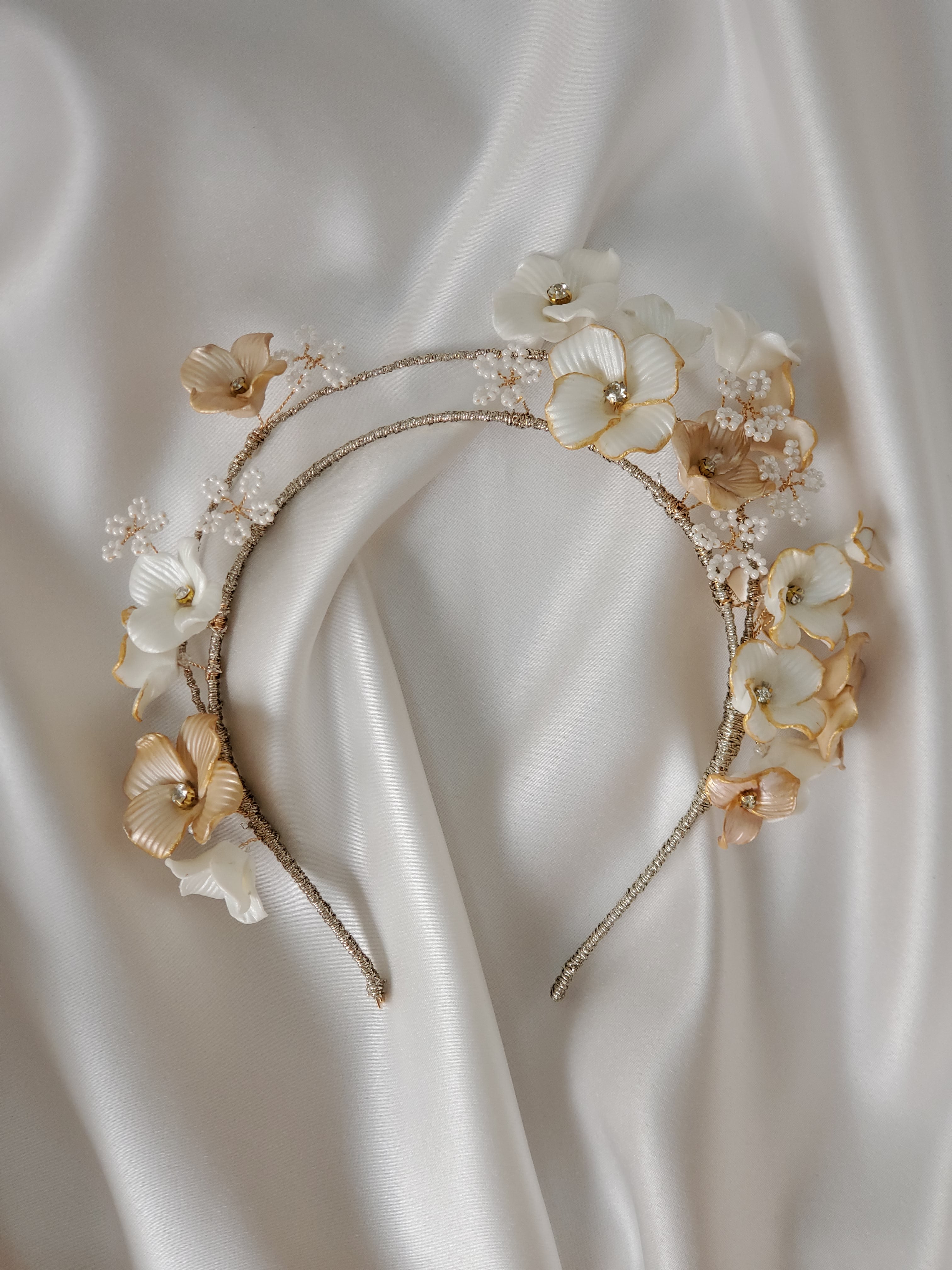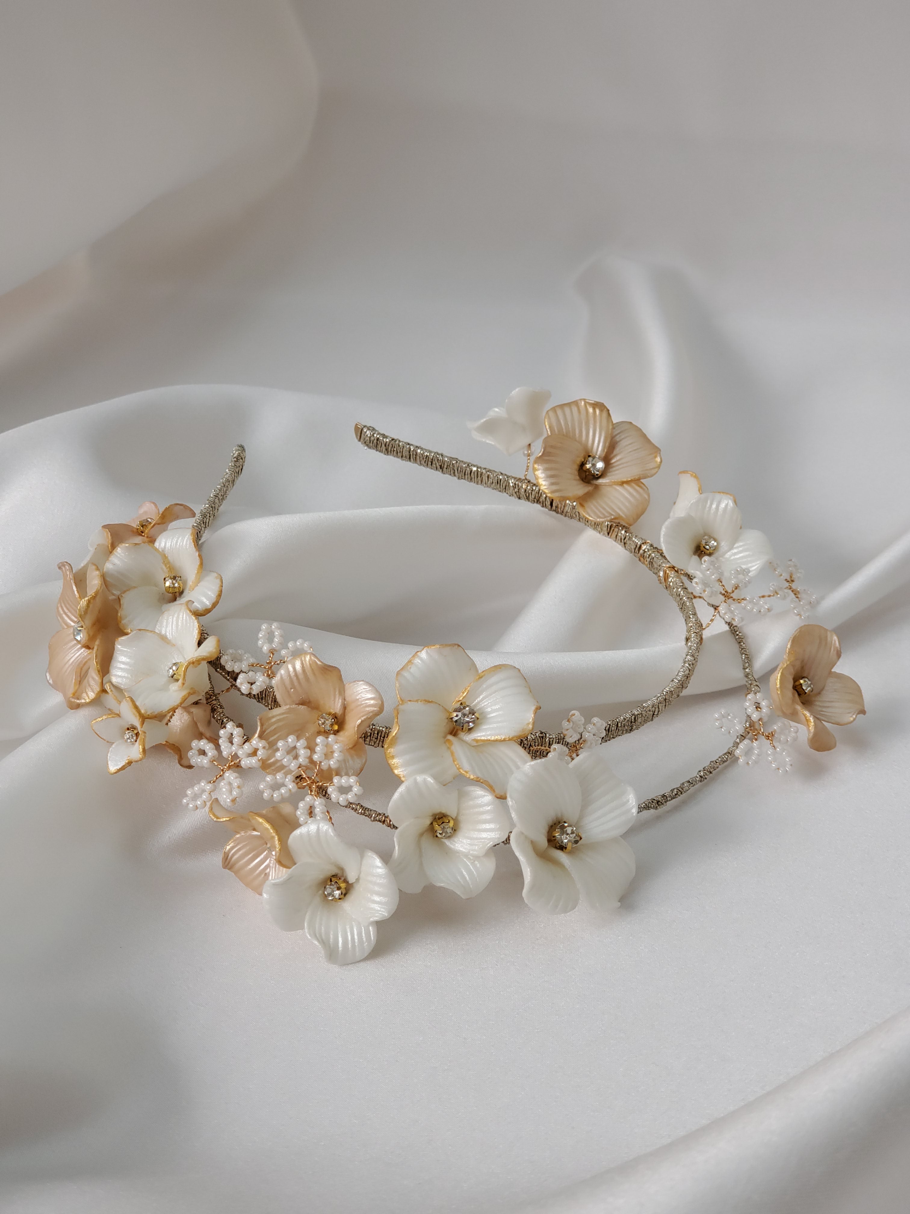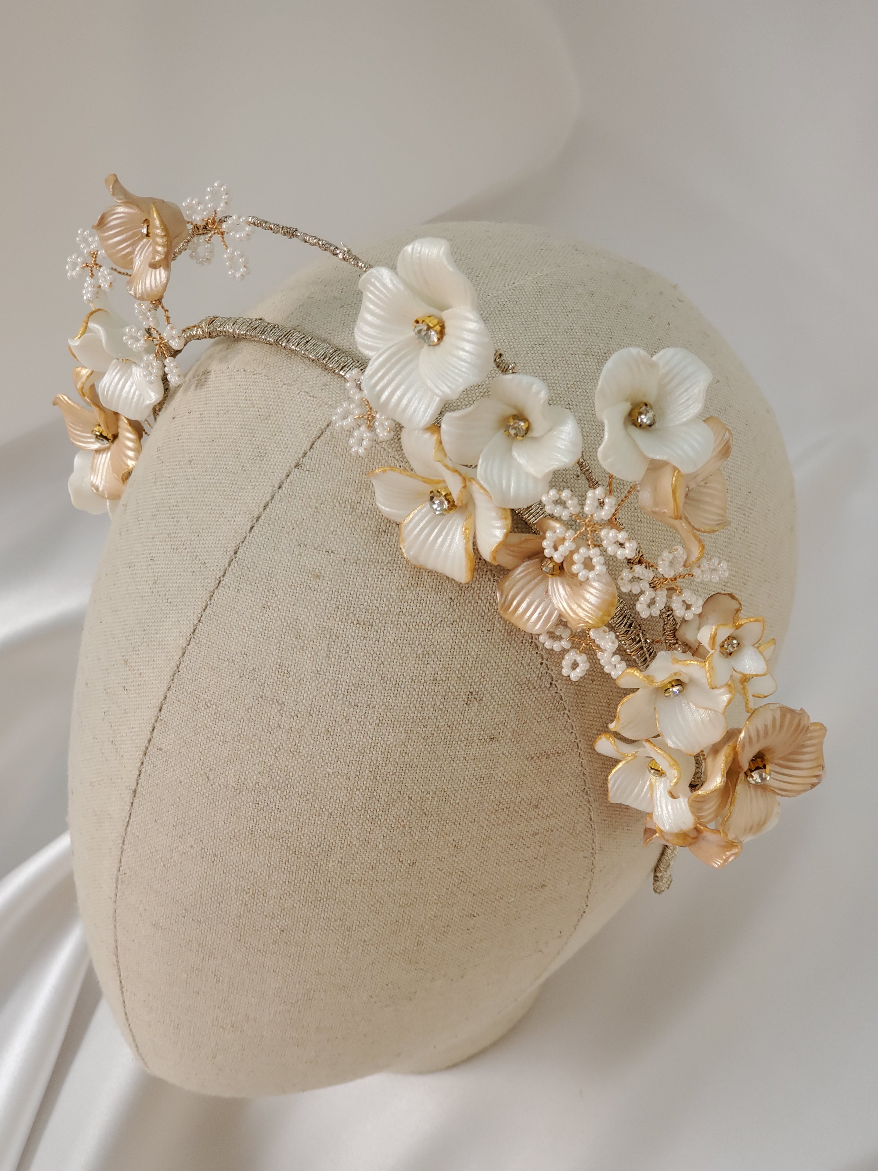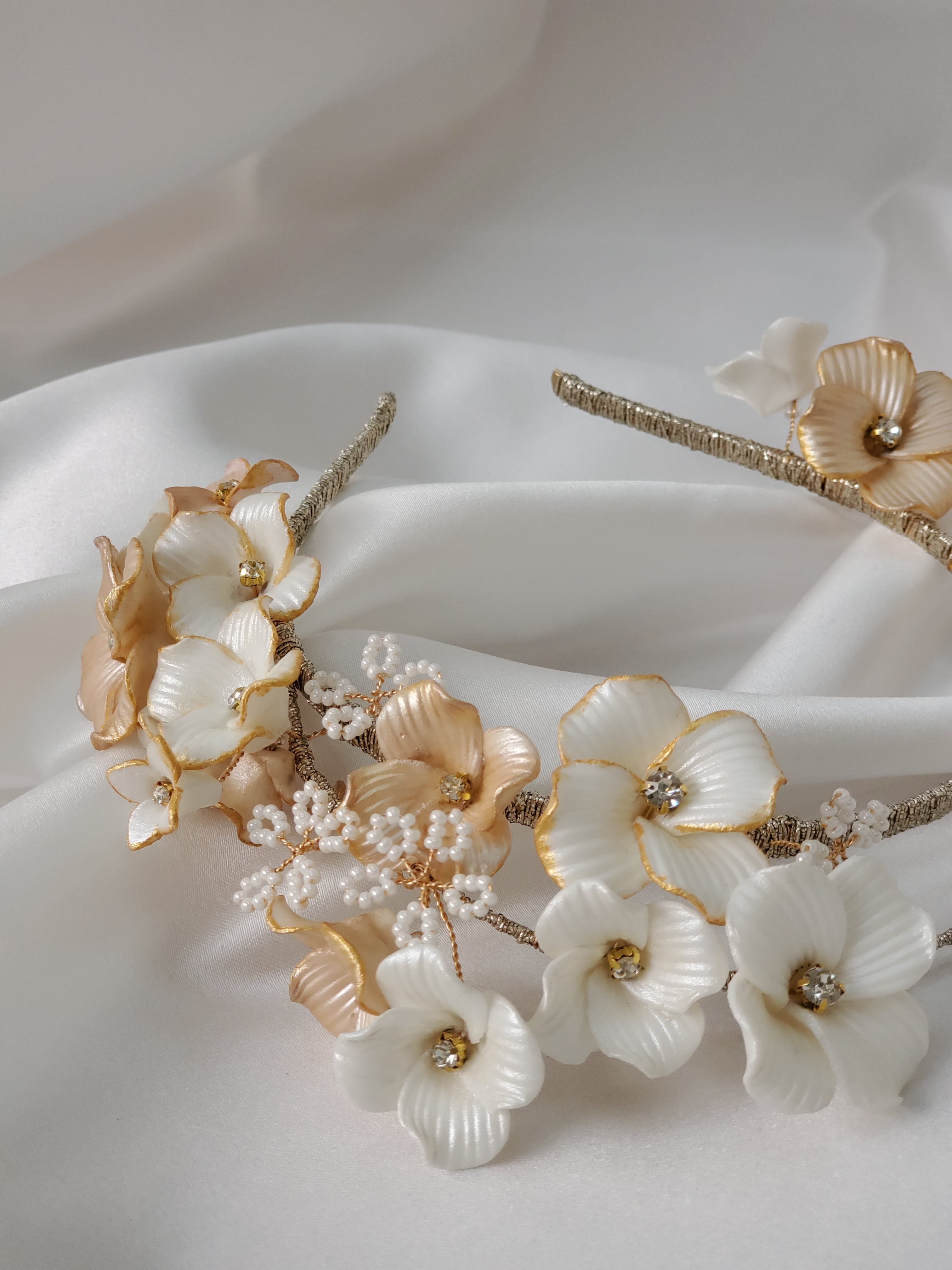 For a look that is effortlessly elegant and subtly captivating, this wildflower-inspired headpiece is the perfect choice. The design is a study in graceful asymmetry, with handcrafted clay blossoms artfully arranged to follow a natural, organic path. Each flower is hand-painted in a soft, sheer white, champagne and dusted with hints of gold. This warm, luminous effect is complemented by the delicate, sparkling accents of rhinestones and French beaded daisies. It is a modern, understated yet utterly romantic crown for your wedding or any significant event.